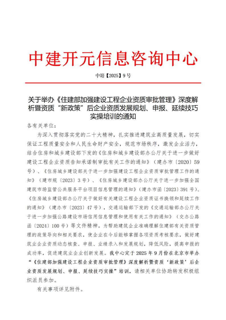 2025年9月11-13日北京市举办建设工程企业资质“新政策”后业绩入库、增项、升级、动态核查等应对培训班